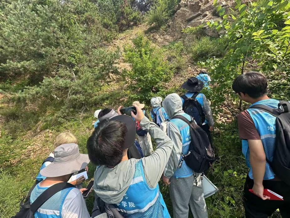 清晨,实习队伍准时到达集合地点,乘坐大巴车前往目的地。队伍首先抵达大顶子山,开展关于风化作用、节理和岩浆岩观察等方面的学习。与其他路线的学习不同,同学们首次观察到花岗岩的释重节理。在带队老师的耐心讲解下,花岗岩裂缝的成因和释重节理的形成过程等一系列地质知识变得简单易懂。在实习区域内,同学们还观察到大块花岗岩转石和侵入现象。在这个过程中,大家认真记录并提出自己的问题,学习热情十分高涨。