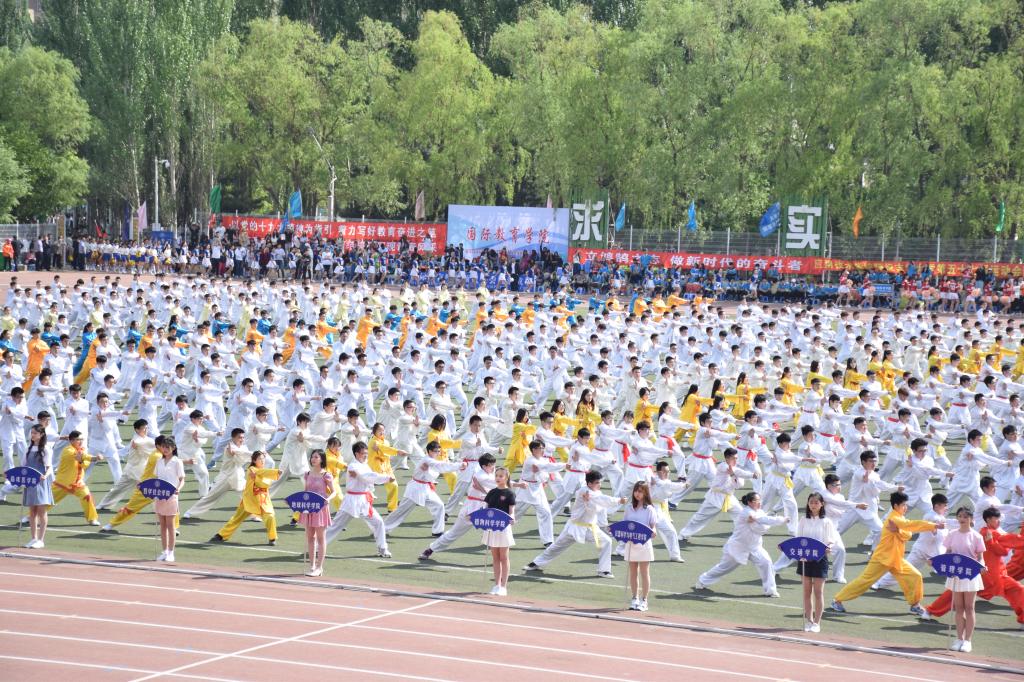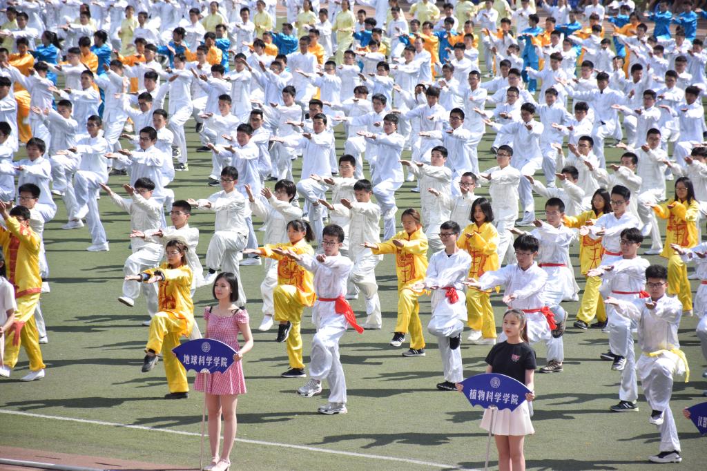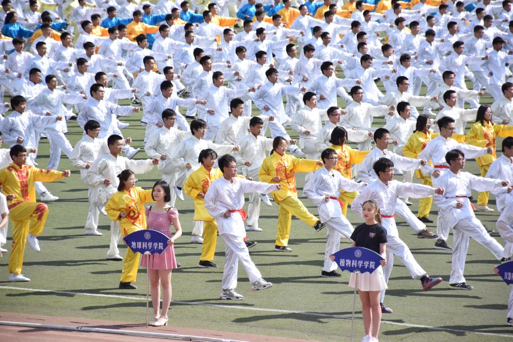 在经过了一个月的悉心排练,长拳的表演者们早已充满了信心。随着声令下,地科的长拳运动员们快速的到达田径场中心并排出整齐的队形。伴着响彻云霄的音乐声,他们用娴熟的拳法吸引着在场观众的视线。一下接着一下,左右的变幻,前后的切换,令人震撼于其迸发的力量,澎湃的激情!